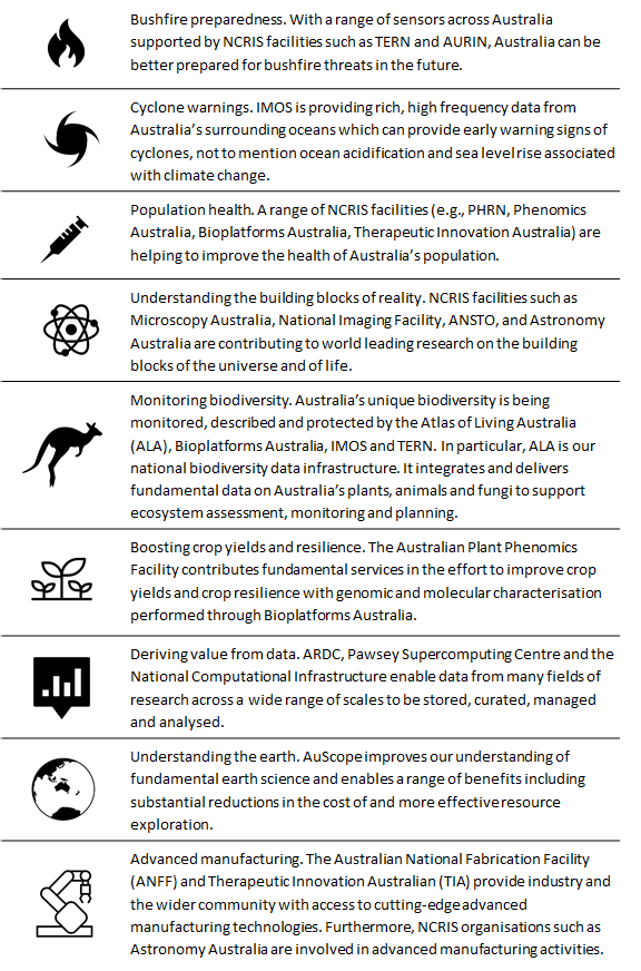 Selected examples of major benefits of NCRIS-supported infrastructure to the Australian community from the National Collaborative Research Infrastructure (NCRIS) spending and economic growth report, June 2021.